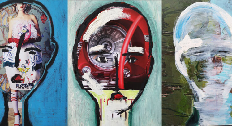 Grazie per questa domanda, mi fa molto piacere poter approfondire questo argomento. La serie Reuse nasce come tutte altre serie, Flowers, Family, Aporia e Woman quasi per caso. In realtà ma man mano che faccio capisco cosa sto facendo, all’inizio non è facile comprendere questo processo artistico e ci vuole molta forza e pazienza perché l’uomo cerca sempre risposte in quello che fa e specialmente nell’epoca tecnologica in cui viviamo le abbiamo sempre più velocemente. Ma l’Arte a volte non è razionale…e non da risposte immediate…Ma una volta capito cosa si sta facendo, poi si tratta di alimentare questa serie e di sostenerla. Reuse Colletion è una ciclo di opere che parte dall’idea del riutilizzo di una immagine esistente e ne ridà vita ma con un significato diverso. Da una seconda vita all’immagine che sarebbe rimasta chiusa in una rivista dopo essere stata vista. Diventa come un Ready Made pittorico che prende spunto dai Dadaisti e quindi da riviste di moda, giornali d’arte o fumetti o da una vecchia tela già dipinta. Ecco che ad esempio una sera presi una tavola di legno che avevo in studio sulla quale avevo iniziato un ritratto classico per apprendere le tecniche del restauro rappresentante Agnolo Doni di Raffello Sanzio durante i sabati all’Accademia al corso di restauro, e che non avevo mai finito, la capovolsi e di getto feci l’opera “Raffaello Sanzio”. L’opera rappresenta in sè l’impronta che rimane dell’Aporia dell’immagine come una unione temporale tra l’arte del passato con il presente. Un doppio autoritratto…Forse non è un caso che nel 2020 si sono celebrati i ‘500 anno dalla morte di Raffaello e che il quadro sia stato realizzato nel 2020. Una sera mio padre mi portò vari supporti per dipingere tra cui un suo vecchio quadro di un paesaggio fatto da lui insieme al pittore trevigiano Gianni Ambrogio. L’ho tenuto nel mio studio per mesi con affetto. Poi decisi di inserirlo nella collezione Reuse, ruotandolo e dipingendoci sopra. Ecco, era un paesaggio fatto da mio padre, Ambrogio e da me, ma non era più un paesaggio ma è diventato un volto. Durante un soggiorno con la famiglia in un piccolo borgo vicino a Firenze vidi una rivista di moda russa e iniziai a sfogliarla. Notai dei dettagli che mi colpissero molto, la valigia, l’auto storica, i gioielli, la sposa, la modella,… ecco che divennero parte della collezione Reuse. Tornando da un viaggio da Singapore presi una mappa turistica che comprai in città e ci dipinsi sopra, senza particolare attenzione ai luoghi che venivano rappresentati, ecco che è nata Reuse Maps. Oppure per casualità nel 2019 è nata “Reuse Monnalisa”…non sapevo che il 2019 erano i festeggiamenti dei 500anni di Leonardo…