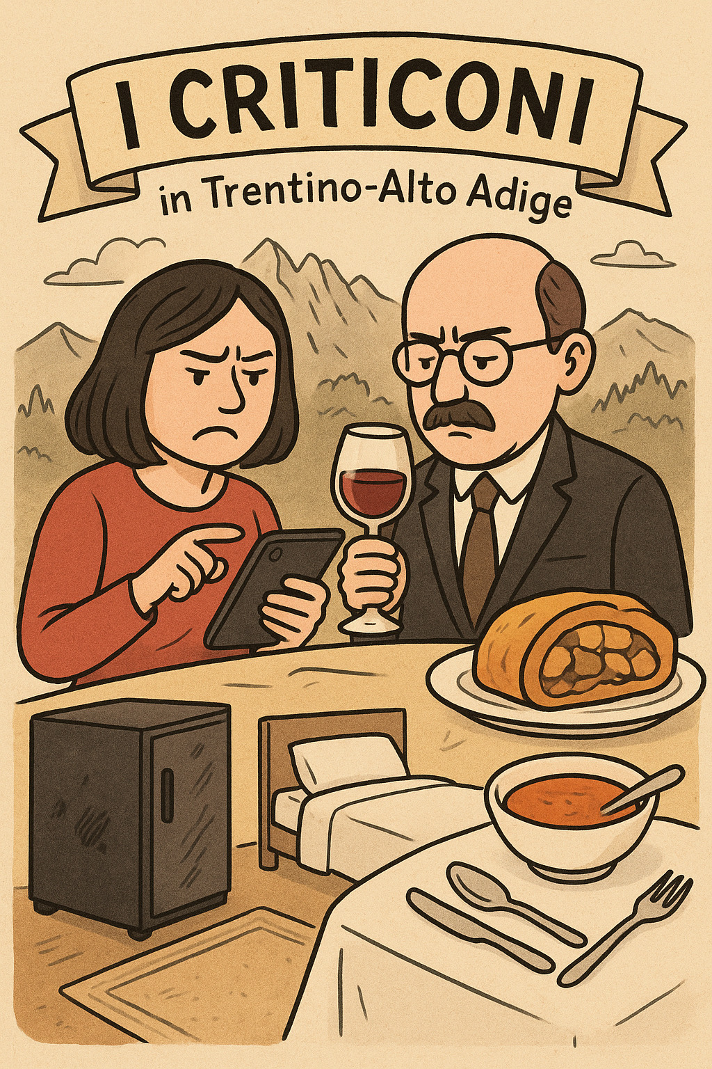 Il viaggio verso il Trentino-Alto Adige aveva tutte le premesse della perfezione. Il sole che batteva sui tetti di legno, le valli tappezzate di vigneti ordinati come eserciti pronti al raccolto, l’aria rarefatta che profumava di resina e libertà. Mirtilla, influencer dal caschetto sempre fresco di phon e dalla mano allenata a scattare fotografie con la precisione di un drone militare, si era già preparata a una carrellata di stories su Instagram. Monsignor Gianfilippo — che non era affatto un monsignore ma aveva deciso di adottare il titolo per dare un tono autorevole alle sue recensioni — si accarezzava i baffi sottili come un maître sommelier prima del servizio, pronto a registrare ogni dettaglio.