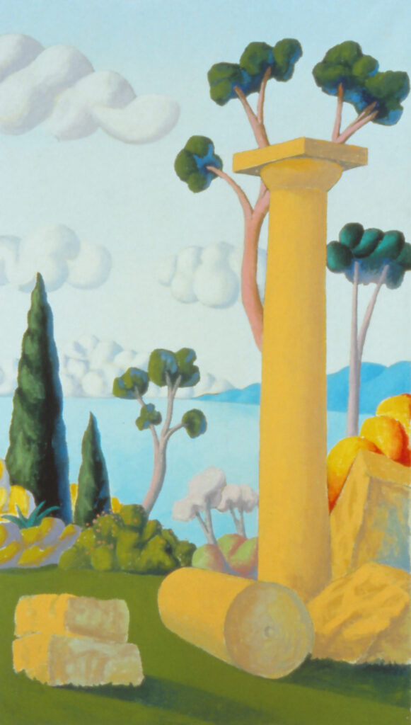 1) ” non cercando di reinventare nuovi temi e forme, ma al contrario mettendo in moto una pratica continua di rivisitazione citazionista della grande tradizione dell’arte del passato ispirandosi, per certi versi, all’atteggiamento sovranamente “inattuale” del Pictor Optimus: Giorgio De Chirico. La sua linea operativa si sposta dall’avanguardia ad una attitudine post moderna, in anticipo rispetto a tendenze come la Transavanguardia (….) esempio emblematico di questa evoluzione sono i suoi più noti cicli tematici: i metafisici paesaggi di rovine classiche, i fiabeschi scenari esotici e la suggestiva paesaggistica. (Salvo, la reinvenzione della pittura di Francesco Poli in Arte Mondadori, Novembre 2024).