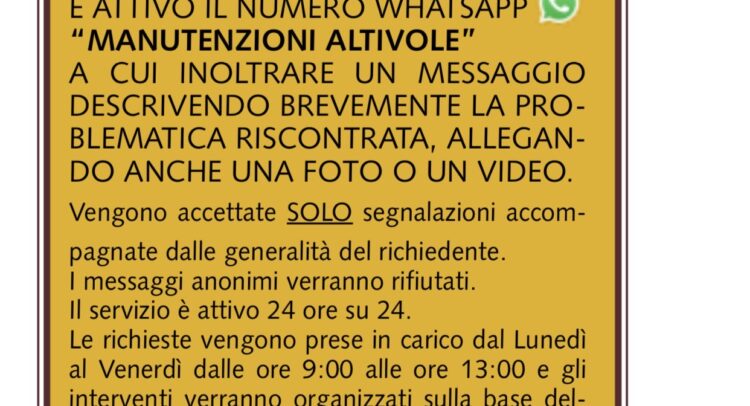 Il Comune di Altivole ha attivato il nuovo numero Whatsapp per consentire ai cittadini di segnalare in tempo reale eventuali criticità inerenti a strade, marciapiedi, dissesti del manto stradale, punti luce spenti. «Il servizio “Manutenzioni Altivole” è attivo 24 ore su 24», comunica il sindaco Chiara Busnardo. «Vengono accettate solo segnalazioni accompagnate dalle generalità del richiedente. I messaggi anonimi verranno rifiutati. Viene richiesto ai cittadini di descrivere brevemente la problematica riscontrata, allegando anche una foto o un video». Le richieste vengono prese in carico da lunedì a venerdì dalle 9 alle 13. «Gli interventi saranno programmati in base alla gravità della segnalazione e dell’ organizzazione dell’azienda manutentrice». Ecco il numero “Manutenzioni Altivole” a cui inoltrare il messaggio: 3357463221. «Il servizio nasce dall’esigenza di avvicinare il Comune al cittadino rendendo più facile e immediata la segnalazione dei guasti e delle problematiche inerenti strade e luoghi pubblici», sottolinea l’assessore ai Lavori Pubblici Andrea Folador. «Creare un canale unico a cui far affluire le segnalazioni consente di migliorare il lavoro degli operatori, rendendo più efficiente la risposta e più veloce l’intervento di manutenzione ove necessario».