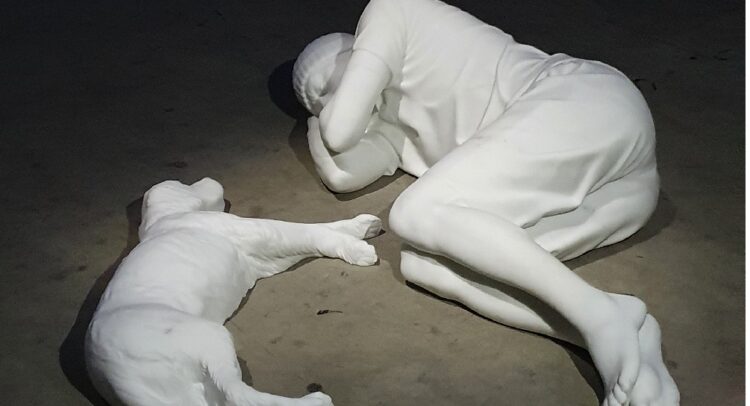 La cosa più interessante di Maurizio Cattelan sul linguaggio contemporaneo sembra proprio quella di riuscire a tradurre il nostro immaginario collettivo in visioni concrete. “Oggi l’arte significa per me fare vedere le cose da un punto di vista leggermente diverso, da un’altra angolazione…. prendere qualcosa che è sotto gli occhi di tutti e metterlo in una luce tale da risvegliare la gente, farla pensare o discutere.” Questa sua “superficialità” linguistica riveste opere opere come Lullaby del 94, sono le macerie dell’attentato al PAC di Milano poste in una galleria londinese; o La Nona Ora, dove un meteorite colpisce la statua del Papa Woitila; Him, rappresenta la statua di Hitler in ginocchio che prega su un angolo; L.O.V.E. è il dito medio in marmo messo davanti alla Borsa di Milano; o ancora America, è il water d’oro poi trafugato da un museo americano dove era esposto. Opere emblematiche che danno corpo alle nostre frustazioni sociali. Già questo lo renderebbe grande come artista. Ma è soprattutto nella leggenda esistenziale che si fa corpo una riflessione più profonda, la quale rende la sua arte portatrice di morte, o mortifera, per niente ironica come spesso si legge. Sembra che per mantenersi abbia dovuto fare diversi mestieri come molti di Noi. Ma fra i tanti, che lui ha elencato (?), vi è pure qualche mese di lavoro nell’Obitorio della città di Padova. Da qui il gusto per la morte come esperienza personale? In maniera semplice potrebbero bastare le foto della Morgue di Andres Serrano per giustificarlo, invece il problema sembra più profondo e ci coinvolge tutti dal momento che si nasce per morire, e l’intervallo fra la nascita e la morte è la nostra vita con lo spazio temporale che esistenzialmente comporta. Credo che lui in fondo esorcizzi questo suo bisogno dentro il lato oscuro, che ci riguarda, proponendoci questa mostra milanese dell’Hangar Bicocca: Breath Ghosts Blind ( si noti la mancanza di virgole fra le parole che accenna a stanze separate). La mostra è una sorta di summa mentale della morte dai primi seppellimenti primitivi, poi attraverso gli egizi, per arrivare fino alla modernità. E’ nelle sepolture preistoriche nella Tundra che si sono trovate le mummie ripiegate in maniera fetale. Spesso accompagnate da animali che fedeli ai padroni li seguivano nell’aldilà. Così nella sua coppia Breath dove un uomo e un cane, entrambi ricavati in marmo bianco di Carrara “riposano” faccia a faccia. Non solo l’animale nella cultura egiziana è simbolo di passaggi relazionali sia fisici che mentali che sottendono alle loro proprietà relazionali nella sfera della vita. Così per i piccioni tassidermizzati, che sappiamo esseri intelligenti, i quali ti osservano e qualora tu li scacci fuggono per poi ritornare nello stesso luogo in un tentativo snervante di essere riconosciuti quali custodi del luogo. Quindi fantasmi, Ghosts presenti al nostro insensato errare (inteso come muoversi) umano. Pur dentro il vasto percorso della mostra. I Piccioni applicano un controllo millenario del tempo severo e muto di ordine superiore.