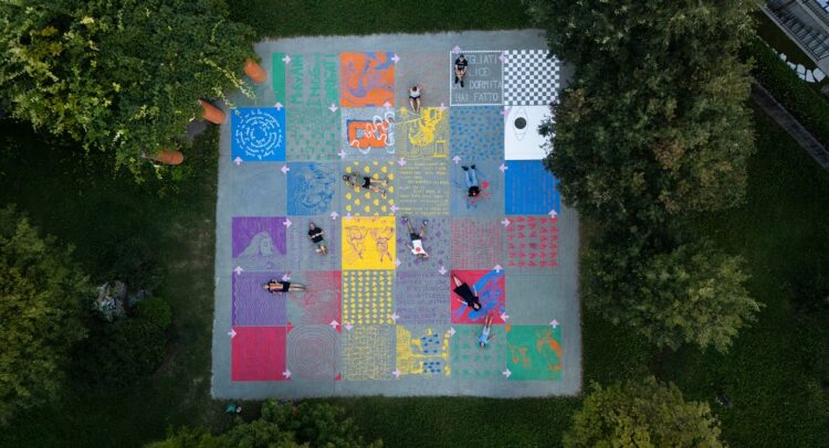 Accanto a queste firme di rilievo, la comunità ha dato vita a un’esperienza condivisa: un grande murale ispirato ad Alice nel Paese delle Meraviglie, mosaico visivo che ha trasformato una superficie anonima in un tappeto di colori e simboli. L’opera, composta da riquadri variopinti realizzati da centinaia tra adulti, ragazzi e bambini, racconta in chiave grafica e cromatica i personaggi e i mondi fantastici della fiaba di Lewis Carroll. Dal cielo appare come una scacchiera immaginifica: volti, frasi, animali e segni astratti convivono in un insieme armonico, attraversato da frecce rosa che sembrano guidare lo sguardo dentro il sogno.