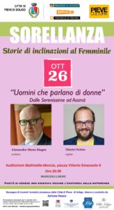 Il tema conduttore della terza serata della rassegna “Sorellanza” è la narrazione. Gli ospiti sono due uomini che hanno raccontato di donne straordinarie, l’uno con la parola, l’altro con la videocamera; il primo guardando al passato, il secondo con sguardo rivolto al futuro. Martedì 26 ottobre alle 20:30 presso l’auditorium della Biblioteca ‘Battistella Moccia’ di Pieve di Soligo Alessandro Marzo Magno e Dimitri Feltrin parleranno di donne: delle protagoniste dei rispettivi lavori. Nessuna quota azzurra – è l’unica presenza maschile in calendario -, bensì un segno di riconoscenza da parte delle organizzatrici di “Sorellanza” nei confronti di due professionisti che con grande sensibilità e impegno hanno saputo sondare e raccontare il complesso e sfumato universo femminile.
